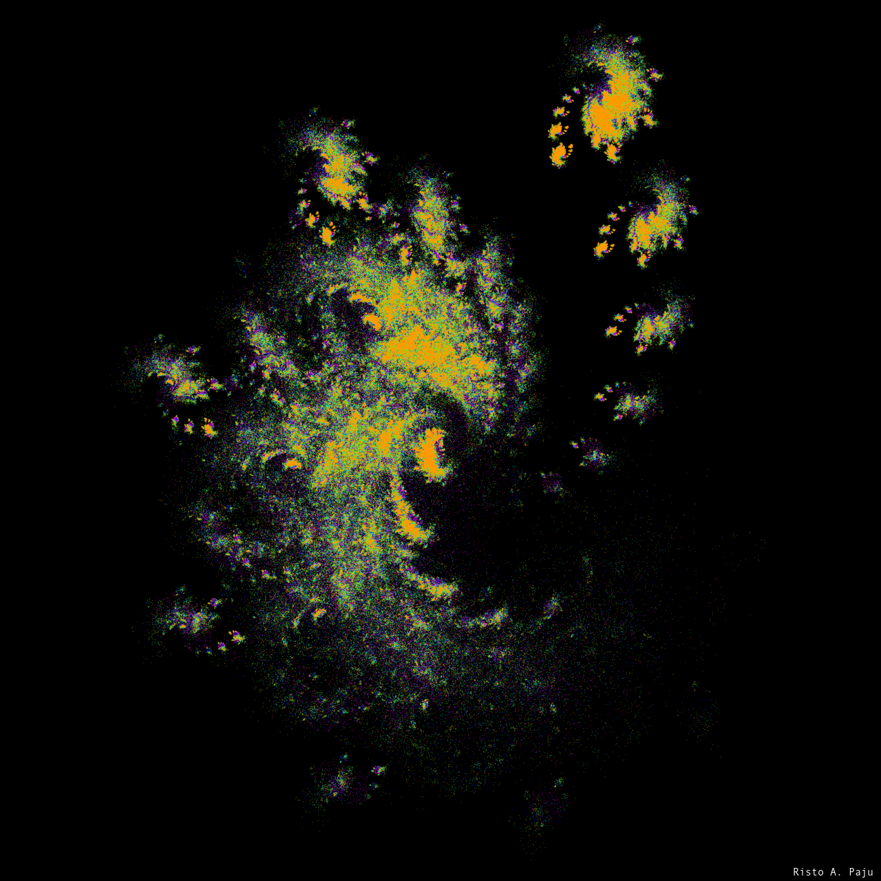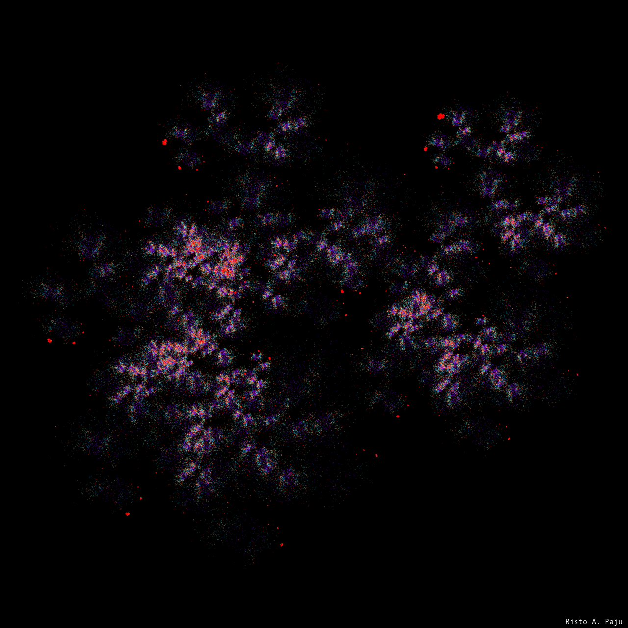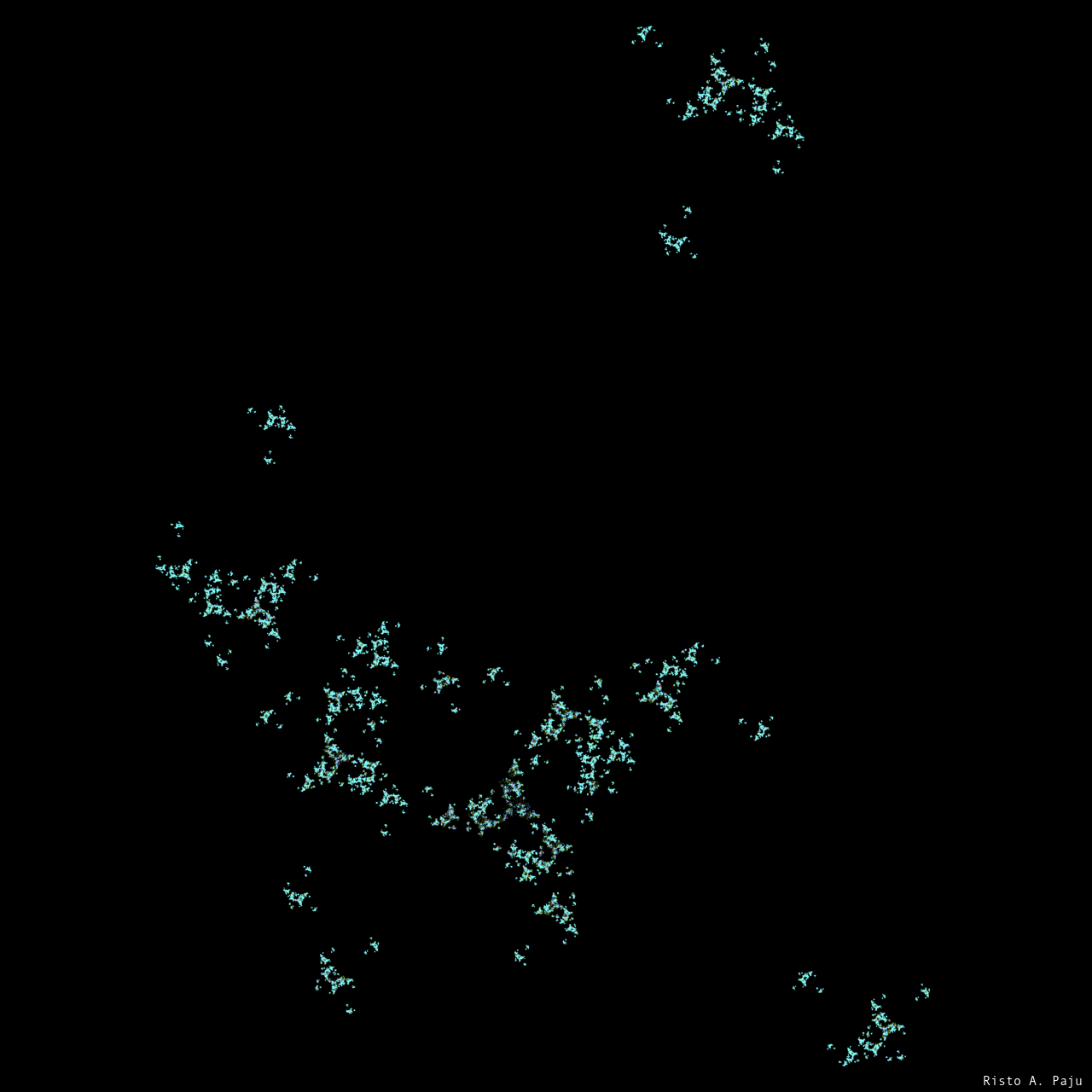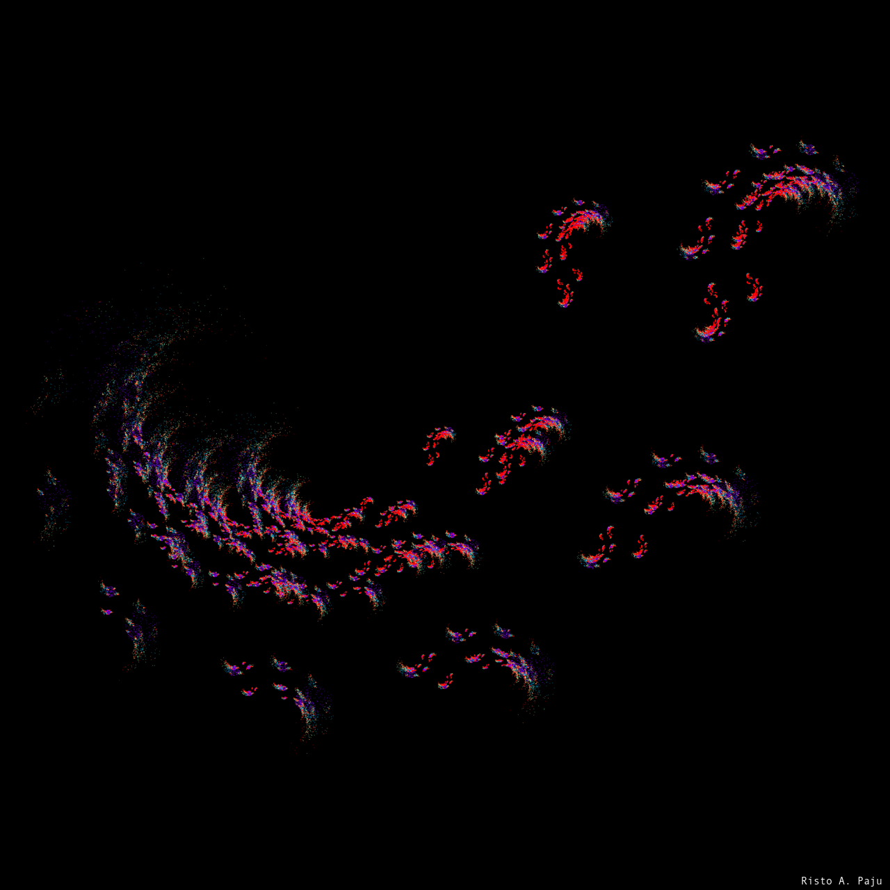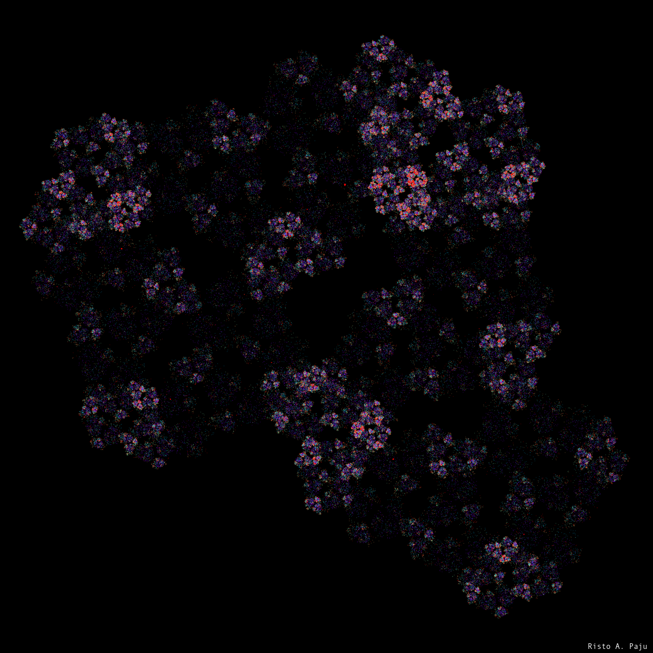 Contraction factors within [0, 1] for a proper IFS, constant shifts within [-1, 1]2. No human selection involved, no parameters saved. Some pictures may look completely dark as they have only few final pixels.