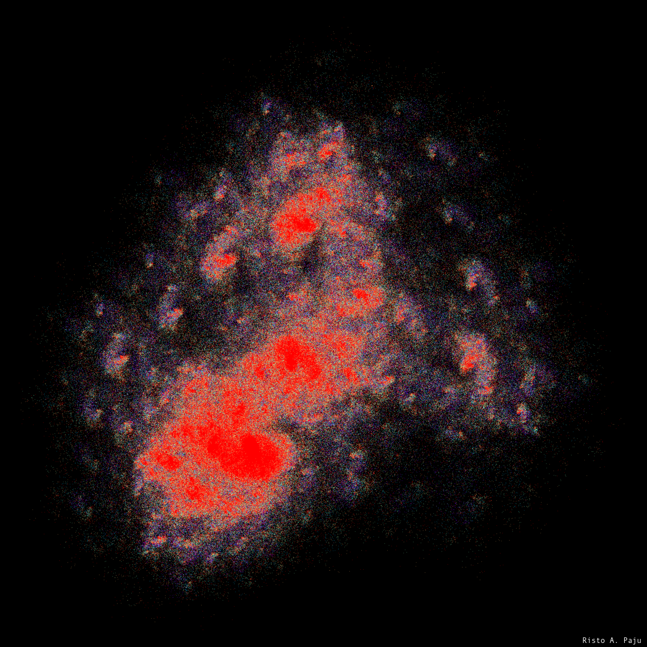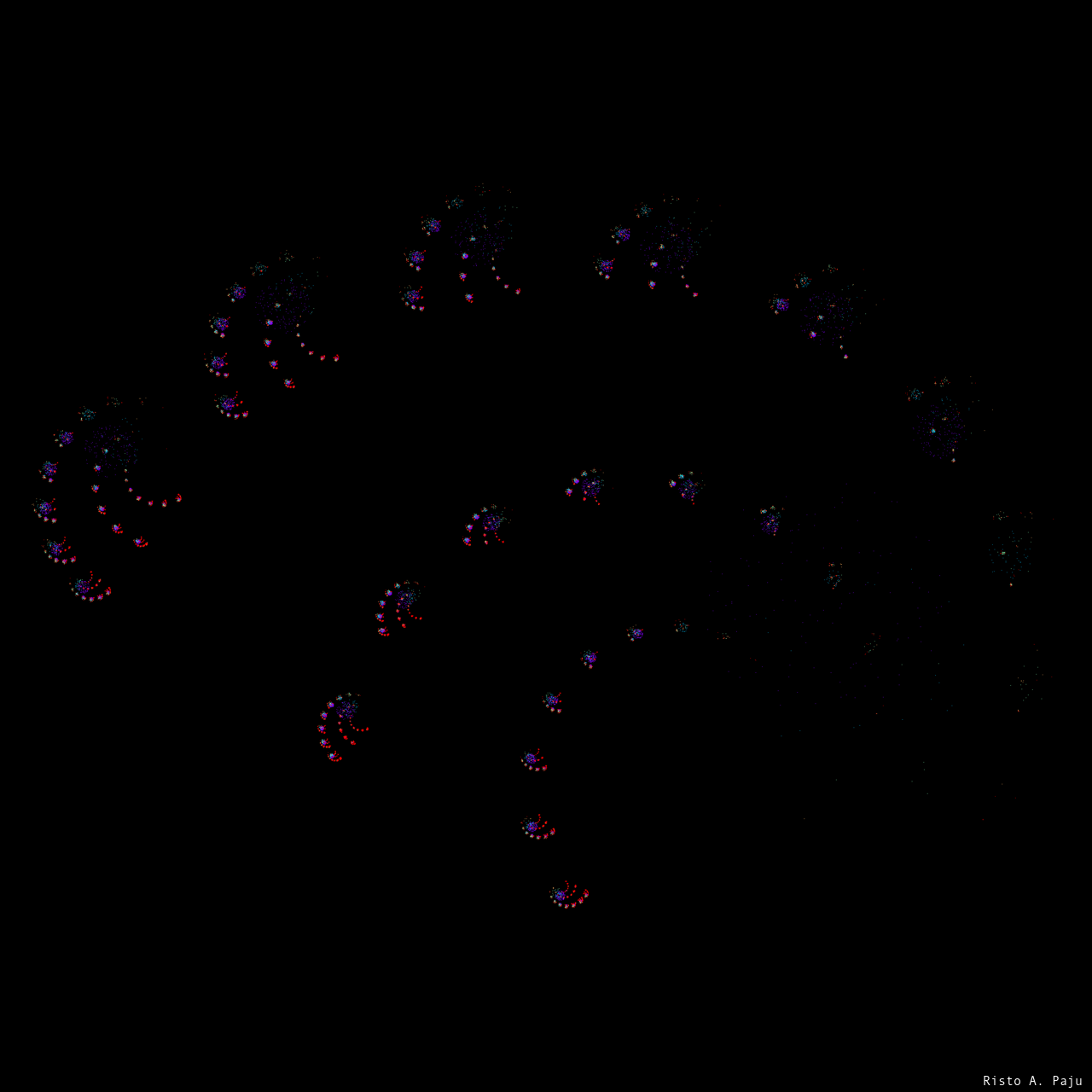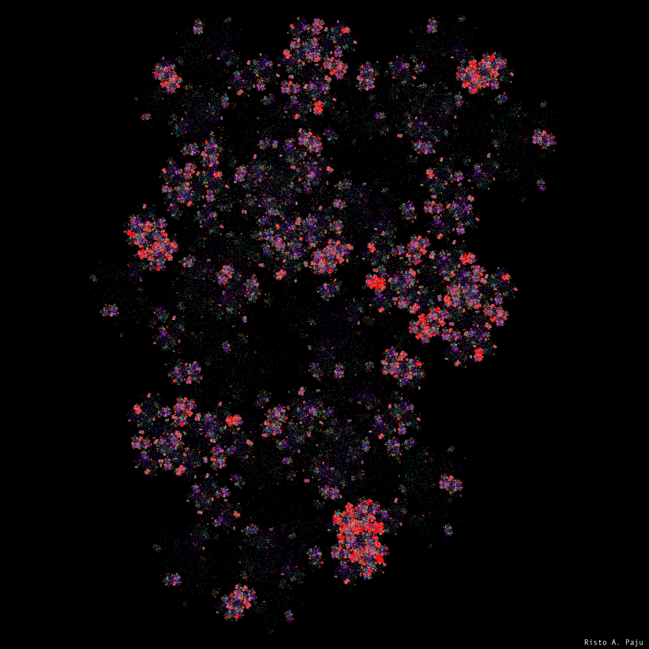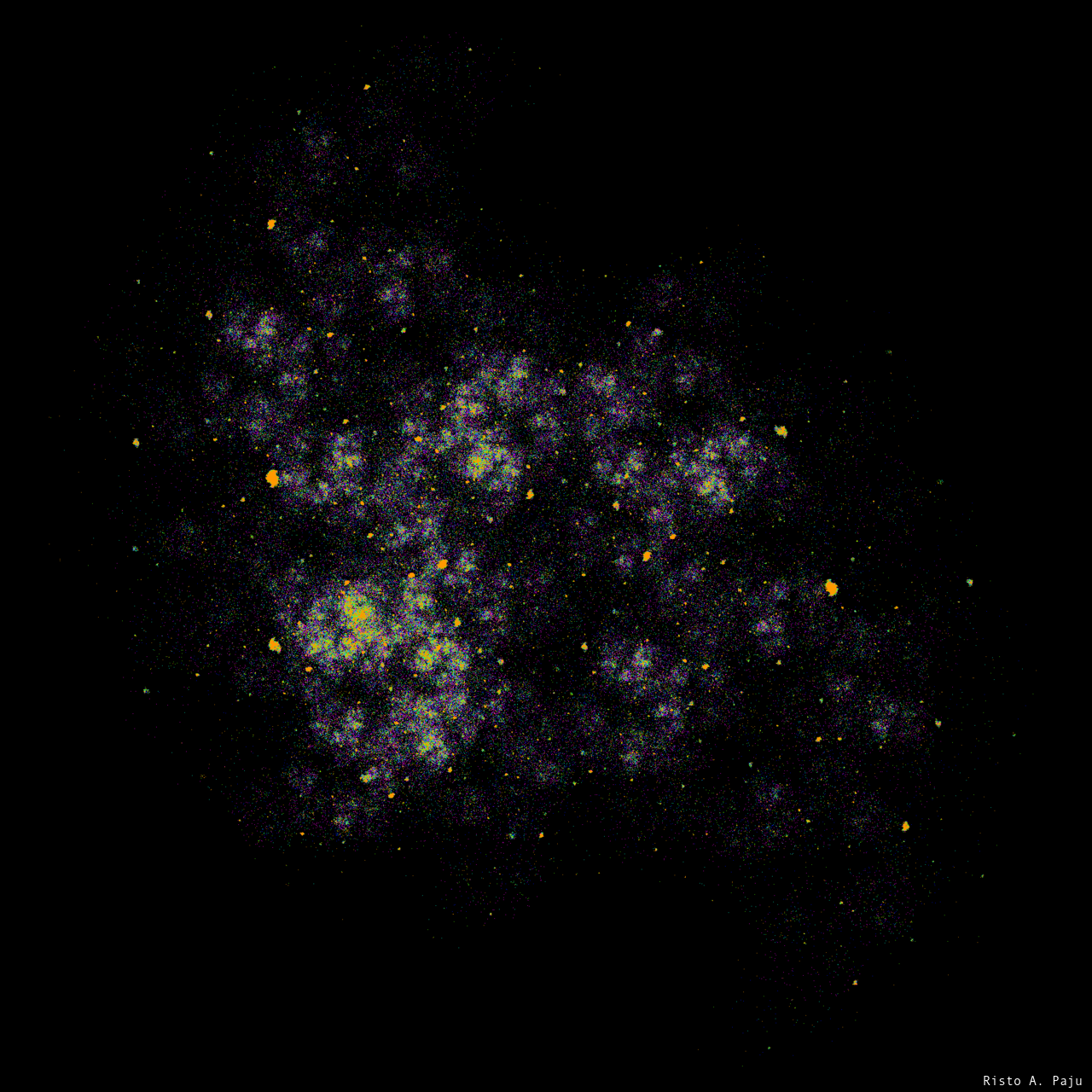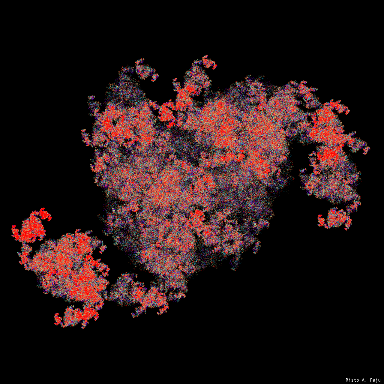 Contraction factors within [0, 1] for a proper IFS, constant shifts within [-1, 1]2. No human selection involved, no parameters saved. Some pictures may look completely dark as they have only few final pixels.